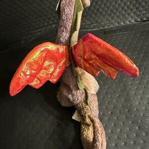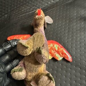The Ty Beanie Baby Scorch is a retired, four-legged dragon known for its distinctive tie-dye, curly-textured fabric and iridescent wings. Scorch was the first Beanie Baby to use this unique curly material.