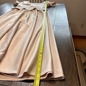 •In excellent shape! Stunning dress in a light silky champagne color is in beautiful condition. There are a couple very light marks on the bottom as seen in images that are unseen with wear. The dress is in fabulous shape.