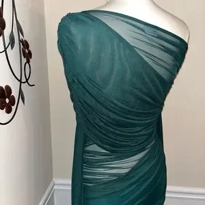 Elegant off-shoulder style. Ruched long sleeves. Ideal for sophisticated events.