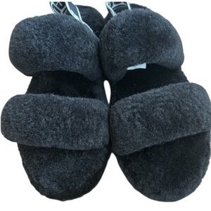 Soft black slides with plush texture. Features UGG logo strap. Ideal for lounging.