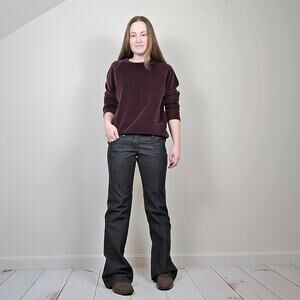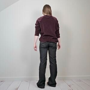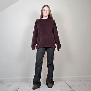 Vintage early 2000s red wine / burgundy / maroon long sleeved tshirt made of a velour style velvet fabric by Calvin Klein. Crew neckline. Tagged a size small but fit is oversized - fitted it is more like a large based on measurements. Can work for a variety of sizes depending on desired fit. Content/care tag has been cut out so that info is unknown. Y2K cord flares pictured are also for sale - see separate listing to bundle both.