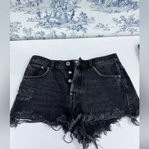 Zara black (faded) high waisted rise with a concealed button fly cut off distressed denim jean shorts.