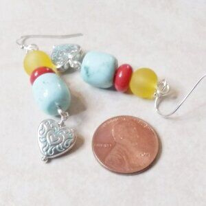 Mixed Media Beads - in an upbeat "beachy" color scheme! Aqua Howlite Beads, coral ceramic beads, yellow frosted glass beads + hand painted metal heart charm. Stainless steel ear wires.