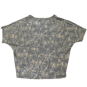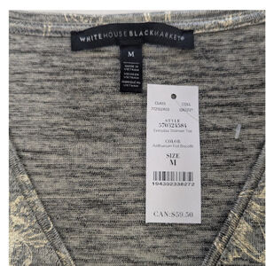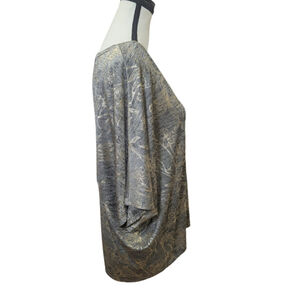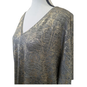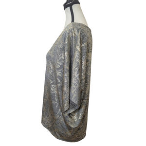 NWT White House Black Market metallic foil dolman top in a soft grey heather knit with gold botanical detailing. The relaxed, boxy silhouette and subtle shimmer create a polished yet effortless look — perfect for elevated casual outfits, workwear chic, or evening layering. V-neckline and dolman sleeves add a modern, draped shape that flatters and feels comfortable.