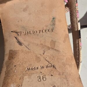 Embrace summer with these Emilio Pucci sandals, showcasing a chic floral pattern in pink and brown. Designed with a T-strap and ankle buckle closure, they offer both style and comfort. Perfect for casual outings, these sandals are a versatile addition to your warm-weather wardrobe.