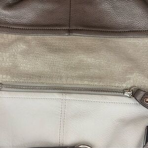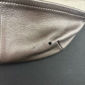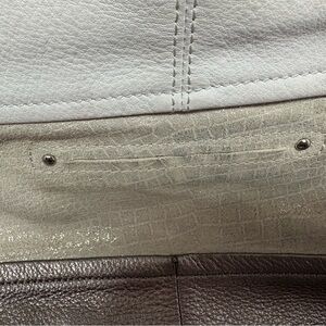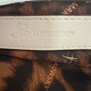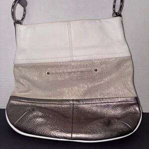 B. Makowsky Metallic Silver Hobo Shoulder Bag. Crafted from supple leather, this medium-sized bucket handbag flaunts a sleek colorblock design in shades of silver, complemented by a chic cheetah print lining. The bag's roomy interior is lined with fabric and includes inner and outer pockets to keep your essentials organized and easily accessible.
