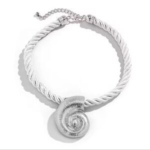 Elegant silver shell pendant necklace with a white twisted cord. Perfect for adding a touch of sophistication to any outfit.