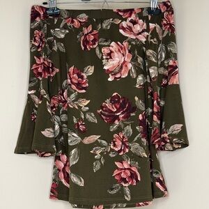 Beautiful Eclipse rose floral off-the-shoulder top with classy 3/4 bell sleeves. Perfect for brunch, date night, or casual chic looks. Flowy arms & comfortable fitted body. Effortlessly stylish.