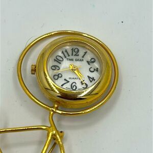 Vintage bicycle pin with a watch at the wheel. Features a time gear quartz watch *that needs a battery* and rhinestones for some added glam.