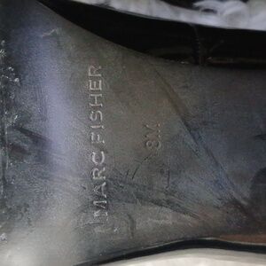 Marc Fisher Glossy Black Grannycore Chunky Heel Loafers with Chain Accent