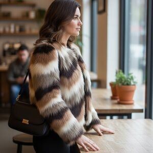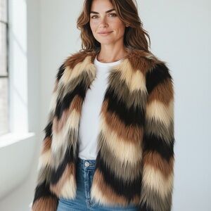 Elevate your style with the Women's Faux Fur Jacket. Featuring a striking multicolor design, this jacket combines black, brown, and cream hues for a bold look. Perfect for adding a touch of luxury to any outfit.
