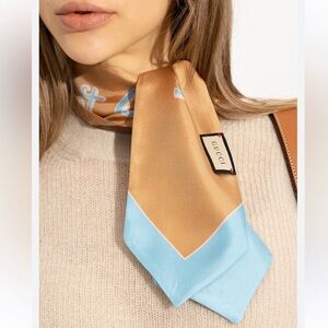 Chic Gucci silk scarf in camel and sky blue. Perfect for adding elegance.