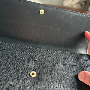 Classic black leather clutch style wallet by Coach. Gold logo accent on front.