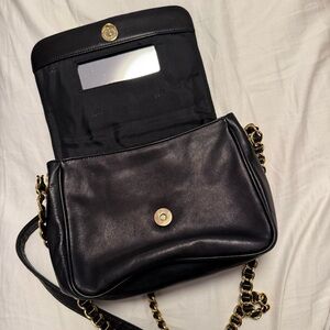 Chic black crossbody bag by Nine West. Features a stylish gold chain strap. Perfect for any occasion. Magnetic closure and a mirror inside. Vintage. Bag is incredibly soft and gorgeous on. Excellent condition.