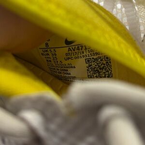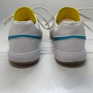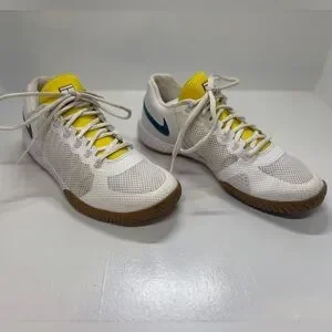 Stylish athletic shoes with a white mesh design and yellow accents. Perfect for sports and casual wear. These shoes are in good shape. See photos for details. Feel free to request more information or make me an offer. Relatively fresh.