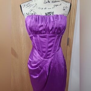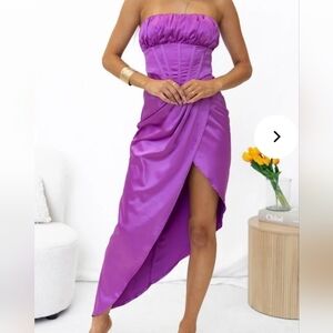 Hello Molly Strapless Basque Waist Corset Ruched Satin Asymmetrical Slit Dress