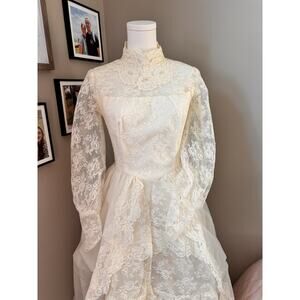 Vintage 60's 70's Victorian Lace Prairie Cottage Wedding Gown Dress High Neck