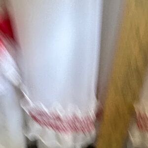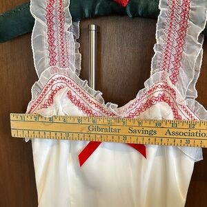 Elegant white dress with red bow accents. Features lace trim and a flowing skirt. Beautiful vintage 1970s prairie-style dress featuring a romantic white silhouette with delicate red lace trim and ribbon accents. Classic cottagecore / Gunne Sax–inspired design with a fitted bodice and flowing layered skirt.