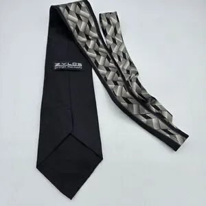 The Zylos George Machado Necktie is a vintage silk tie featuring a geometric square pattern in shades of gray. Measuring 58 inches in length and 4 inches in width, this designer tie is perfect for adding a touch of elegance to any wedding or formal event. The tie is woven with a classic width and includes a logo accent, making it a stylish and versatile accessory for men looking to make a statement with their outfit. Made in the United States, this adjustable necktie is a timeless piece that exudes sophistication and charm.