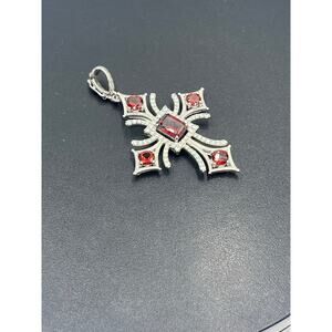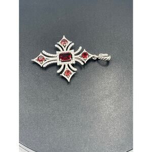 This is a Judith Ripka sterling silver garnet cross enhancer/pendant. It features a large, rectangular-cut red garnet at the center, smaller round garnets set in a decorative cross design, and clear accent stones, likely cubic zirconia (CZ), within the sterling silver setting.