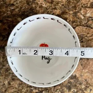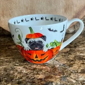 Sweet Pug pup and pumpkins coffee mug from Portobella By Design. Little paw prints and bats around the inside rim. Colorful graphics around and inside entire cup! A great gift for a Pug lover!