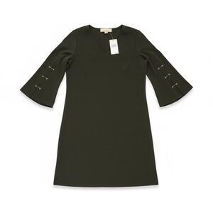 New with tags (NWT) Michael Kors women's size small dress. Olive green color, quarter sleeves, gold chain details. V-neck, shift style. Perfect for casual or workwear.