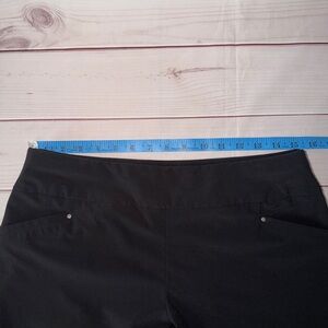 Elegant black straight leg pants by Chico's. Ideal for work or casual wear. Features a sleek design with functional pockets.