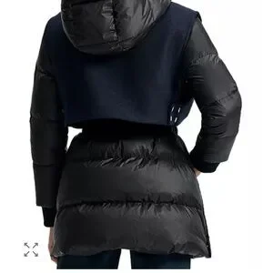 Brand new with tags! Chic puffer jacket with a stylish navy overlay. Features a cozy hood and front pockets. Ideal for cold weather.