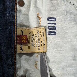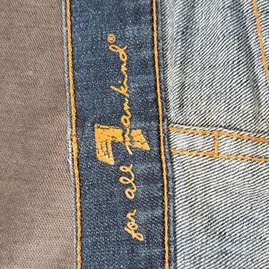 These jeans are used but in good condition. There is some wear from use. The zipper is in good working order. The stitching is a copper colour.