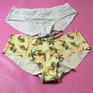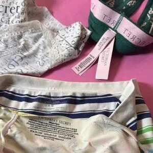 Trio of Victoria's Secret panties. Includes white text, striped, and floral designs.
