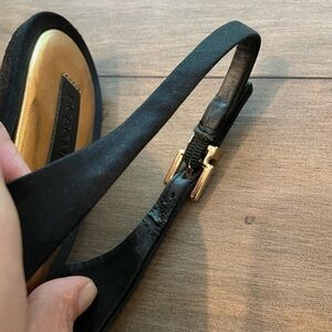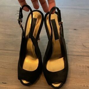 Gently worn, excellent condition. Little wear on soles, minimal scratches on heels as pictured. Some peeling inside of the straps as pictured. None of this noticeable when wearing.