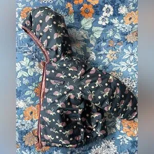 Reversible lavender colored hooded down sweater. One side is solid lavender and the other is navy with lavender plant designs. Freshly washed per Patagonia’s instructions.