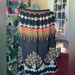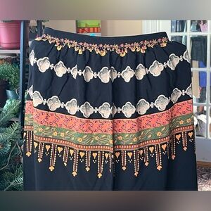 Black skirt with vibrant orange floral patterns with geometric pattern. Perfect for adding a touch of color to your wardrobe.