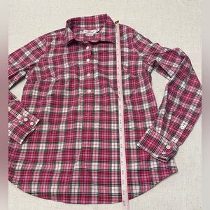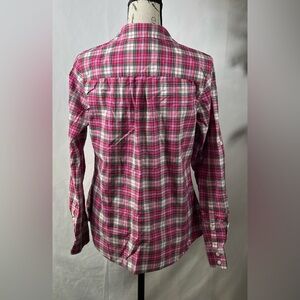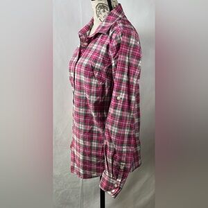 Stylish button down shirt. Pink plaid pattern. Soft and comfortable fabric.