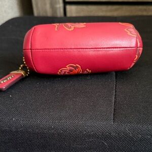 Chic Coach clutch with pink floral pattern. Elegant gold accents. Ideal for any occasion.