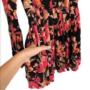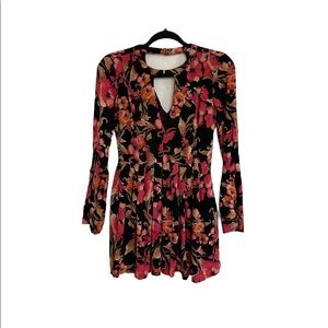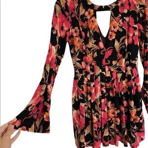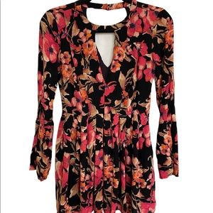 Super cute floral print mini dress by Free People. Retro inspired in a fit and flare silhouette. Long sleeves with slit in the cuff. Cut out detail in the front and black. Side zipper.