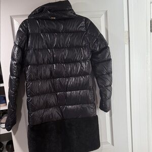 Stylish dark gray puffer coat with luxurious black fur trim. Perfect for cold weather. Size IT 42 (aka a medium)