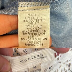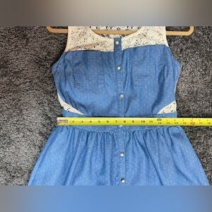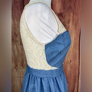 Monteau cream colored lace on back and front, blue denim colored cotton blend sleeveless mini dress with white polka dots. Pearl like buttons, front closure.