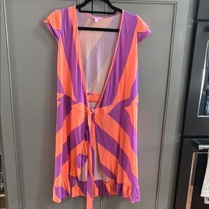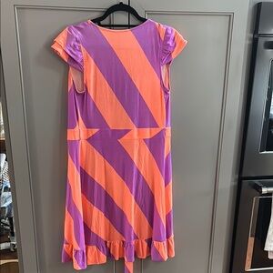 Stylish wrap dress with bold orange and purple stripes. Features a tie front and ruffled hem.sz small
