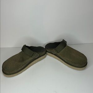 UGG Goldenstar Clogs, Size 9, Color - Green, Clog Style, Adjustable and Moveable Strap, Suede Upper, Socklike Liner, Light Wear through and on Soles, Description/Size Chart/Measurement in pics