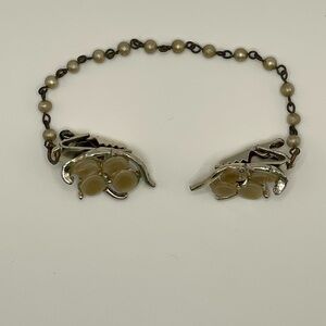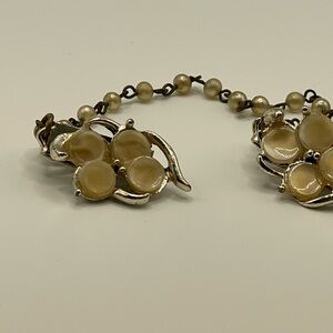 Gorgeous grape cluster clips featuring translucent beige “moonstone glow” cabochons (frosted glass/lucite for that dreamy ethereal shimmer) set in silver-tone metal with delicate leaf accents. Connected by a classic chain of small faux pearls – pure mid-century glamour!