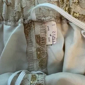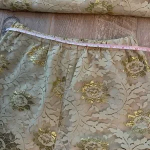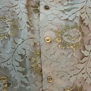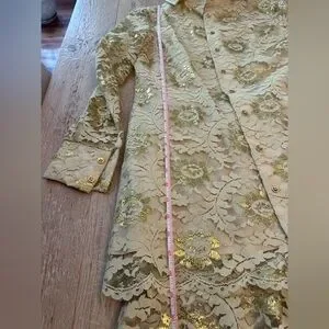 60s Vintage gold floral lace two-piece set. Features a long-sleeve top and matching pants. See photos for measurements