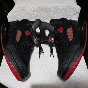 The Air Jordan Spizike sneaker is a hybrid model that blends elements from past Air Jordan models. The ‘Anthracite’ rendition features the black and red color scheme on a nubuck upper with a ballistic mesh mudguard and elephant print panels on the toe and heel.