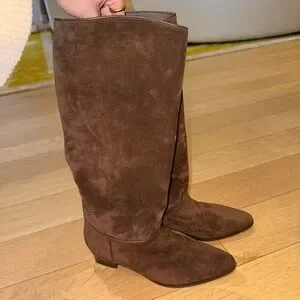 Chic knee-high boots in rich chocolate suede. Perfect for versatile styling.