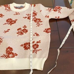 Add a touch of charm to your wardrobe with this floral knit crew neck sweater. The red floral pattern on a cream background offers a stylish and cozy look.