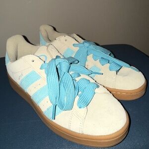 Adidas sneakers with light blue accents and laces. Cream base with a classic design.