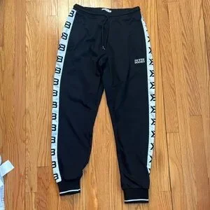 Sleek black joggers with white side accents. Perfect for workouts or casual wear. Comfortable fit with stylish branding.