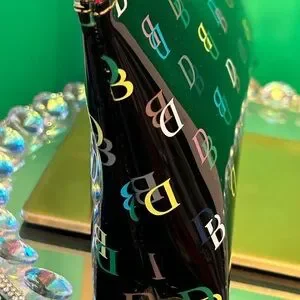 Chic black cosmetic bag with vibrant multicolor logo design. Ideal for stylish organization. Interior: Black Patent Leather. It closes with a red zipper.