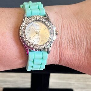 Elegant Geneva watch with a silver face. Aqua band adds a pop of color. Crystal accents enhance the design.