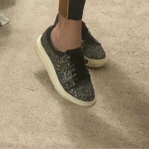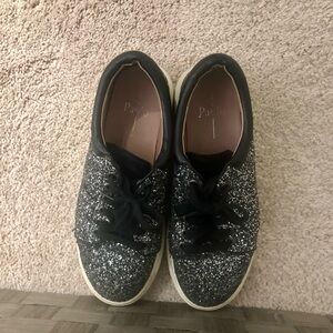 Stylish Paolo sneakers with a glittery silver finish. Black laces and trim. Comfortable and chic design.
